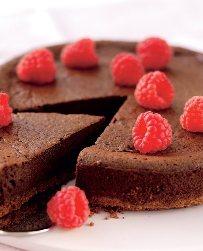 - Add the flour, vanilla and mascarpone and whisk briefly until incorporated. Add the chocolate mixture and blend to combine. Pour into the cake tin and bake for 40-45 minutes. Allow to cool then refrigerate until needed. Serve with fresh raspberries.