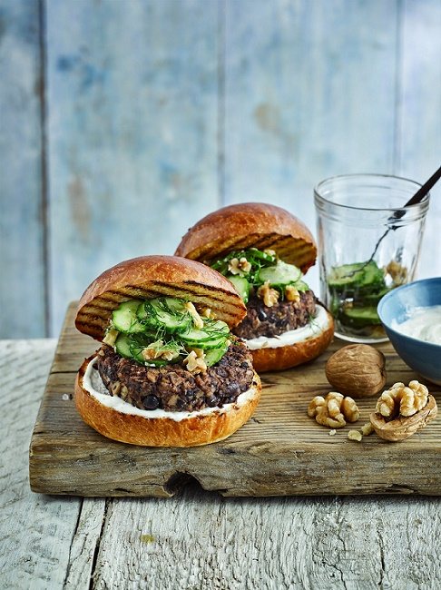 Walnuts add a 'meaty' texture to this burger, blending perfectly with the mushrooms. The California Walnut and cucumber salad adds an extra level of nuttiness enhanced by a drizzle of walnut oil.