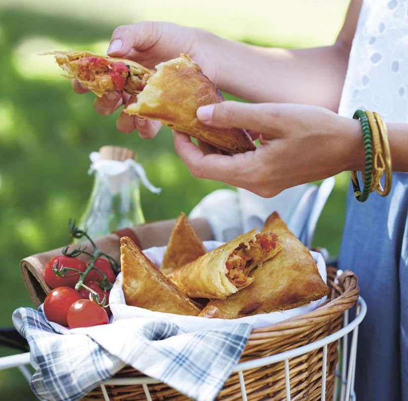 - Cut each sheet of pastry in half from corner to make 4 large triangles in total. Pile the vegetable mixture on one side and brush the edges with a little of the beaten egg. Fold over the pastry to cover the filling and pinch the edges to seal. Transfer the pasties to a baking sheet and brush with a beaten egg.