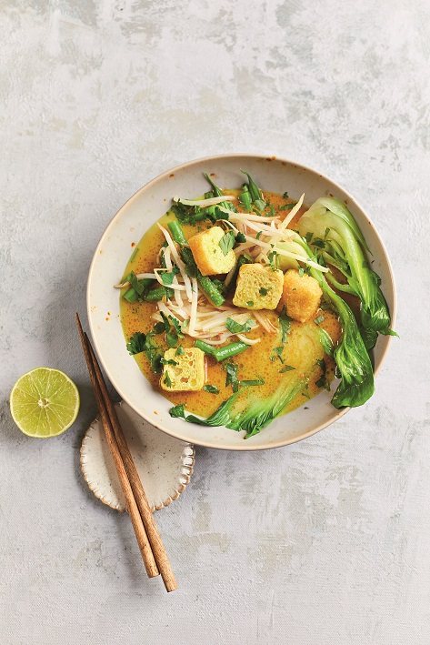 Laksa, the iconic Malaysian spicy coconut soup, is given a vegan twist with a fragrant broth that holds pieces of puffy tofu, rice noodles and green veg. It's a hearty curry-style dish that's perfect for a taste of Southeast Asia. Recipe extracted from The Vegetarian Kitchen by Prue Leith and Peta Leith (Bluebird, £25). Photography: David Loftus