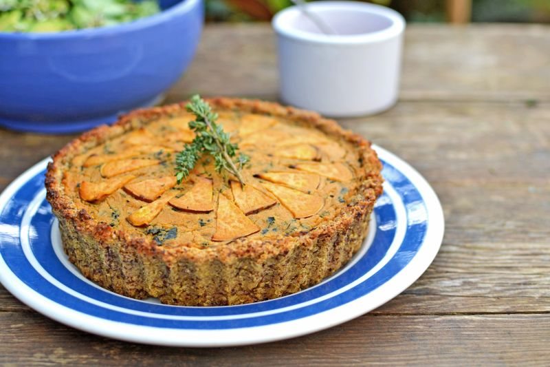 - Spoon the mixture into the quinoa crust, filling right to the brim, smoothing out with a spoon. Bake at 200C/400F/Gas 6 for 30 minutes then turn the oven down and cook for a further 10 minutes on 150C/300F/Gas 2 or until brown.