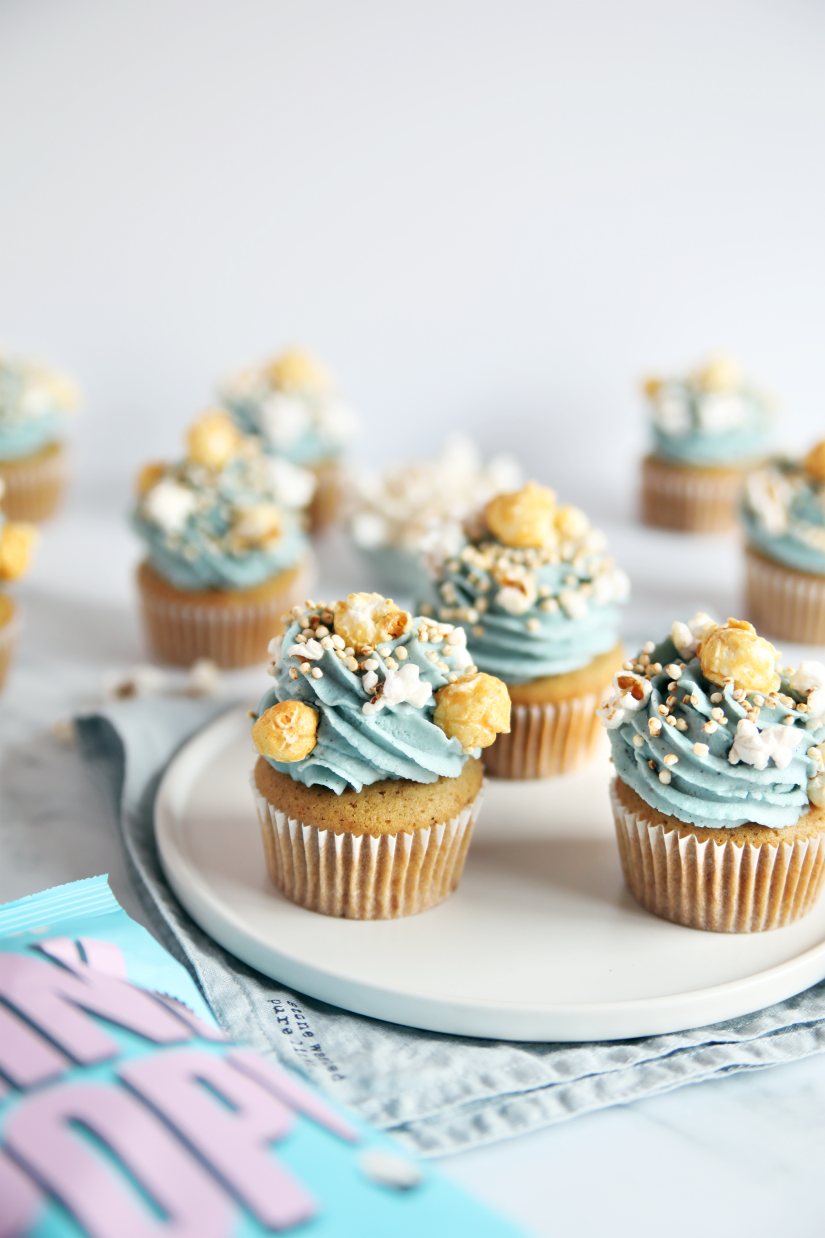 - Frost your cupcakes with the blue buttercream, top with Popcorn Shed’s Mini Pop! Sea Salt popcorn, gourmet Pecan Pie popcorn (if you're not vegan) and puffed quinoa. Store the cupcakes covered in the fridge.
